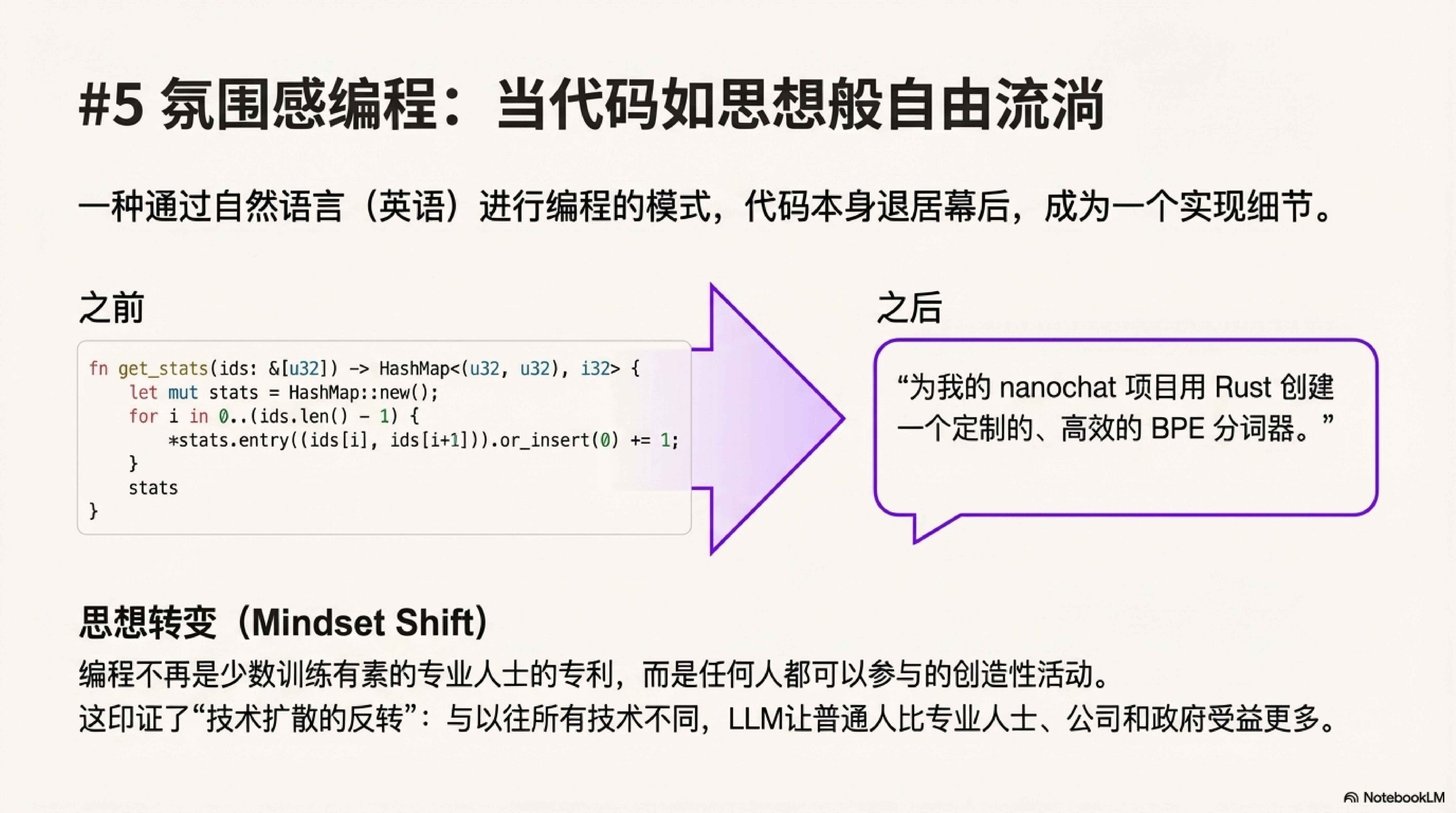 - 能力跨过关键门槛,任何人都能用自然语言“写程序”,甚至忽略底层代码。