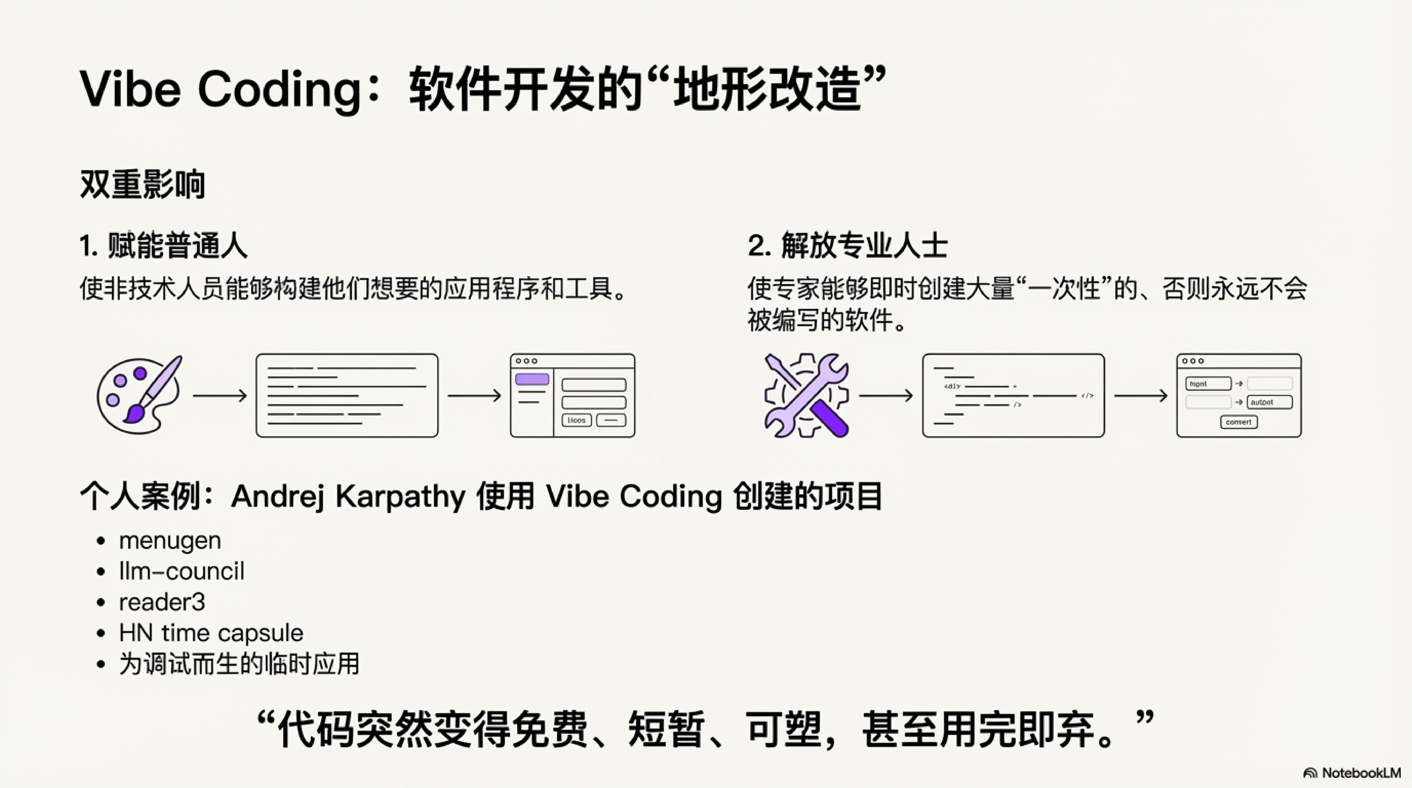 - 在这一时代,代码变得“免费、短暂、可塑”,一次性使用后即可丢弃。