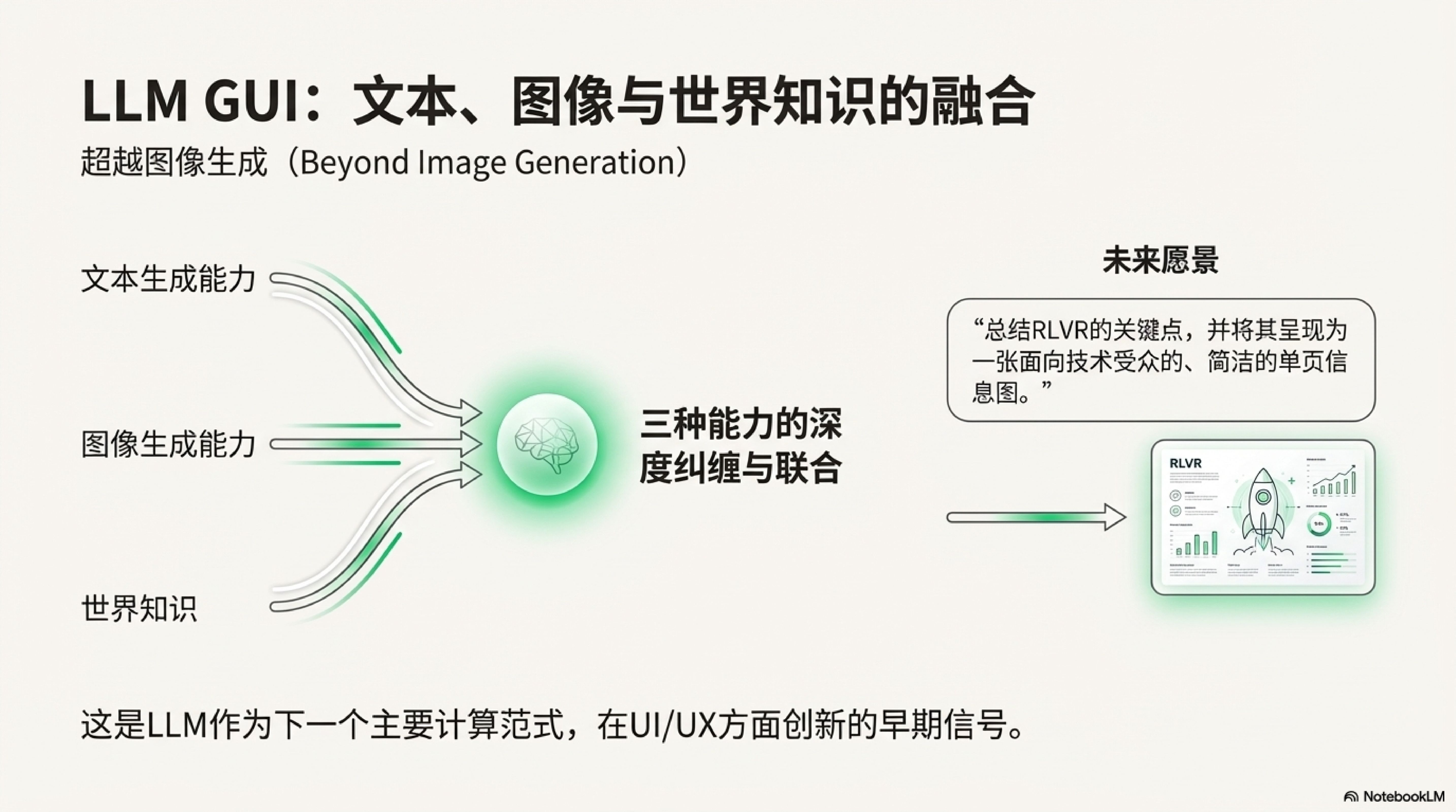 Gemini Nano banana是早期“LLM GUI”雏形:在模型权重中耦合文字生 成、图像生成与世界知识,更直观且贴近人类认知。