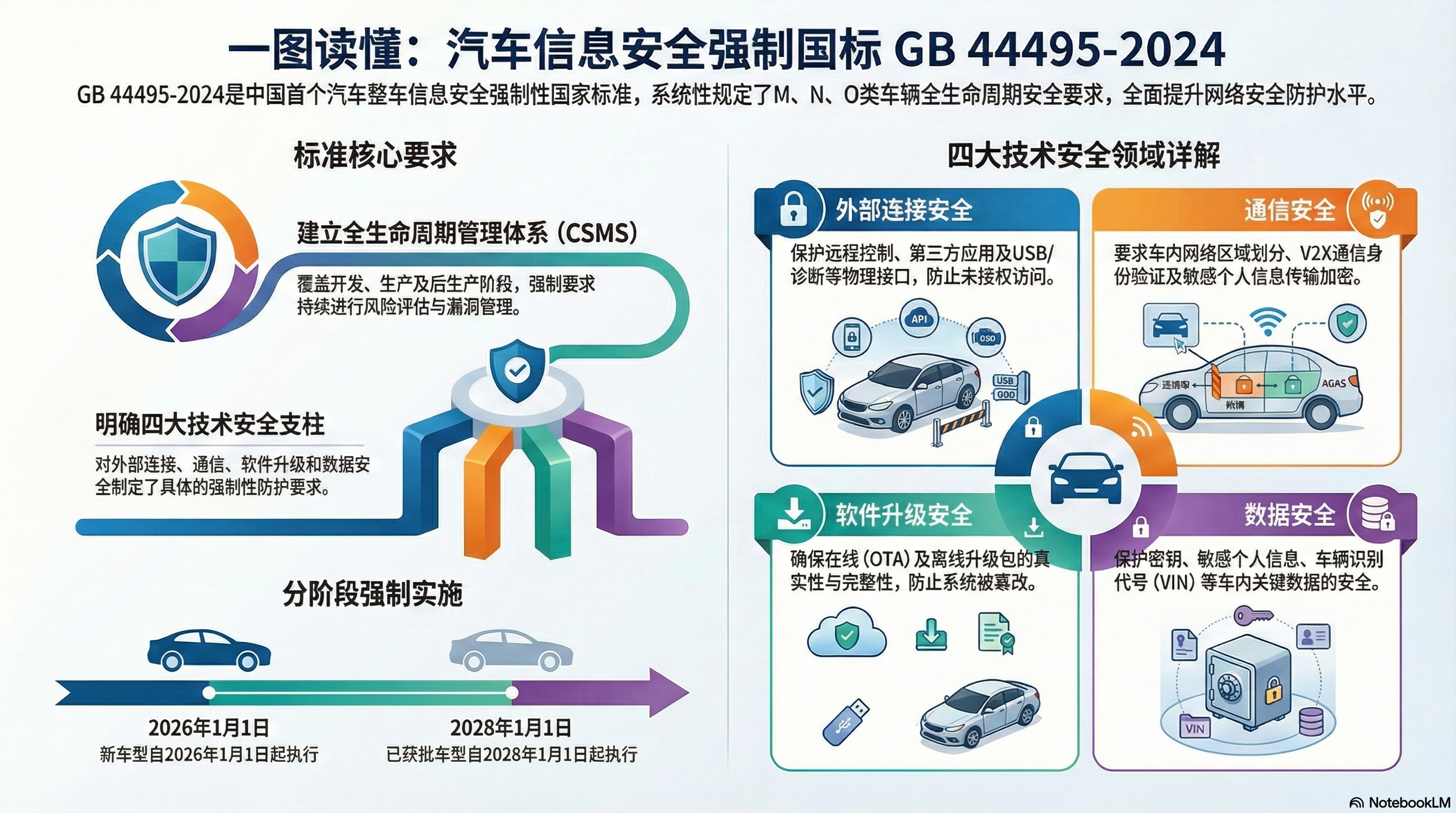 对你意味着什么: 未来你买到的任何一辆合规新车,无论价格高低,其基础信息安 全防护水平都已达到国家强制标准。网络安全不再是豪华配置,而是像安全带一样,成为 所有车辆的必备项。